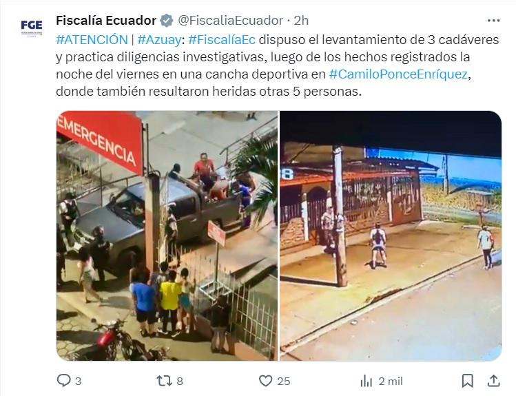 Al menos tres personas fueron asesinadas y otras cinco resultaron heridas en un ataque armado ocurrido la noche del viernes 17 de mayo en una cancha deportiva del cantón Camilo Ponce Enríquez, en la provincia del Azuay. Así lo informó la Fiscalía General del Estado.