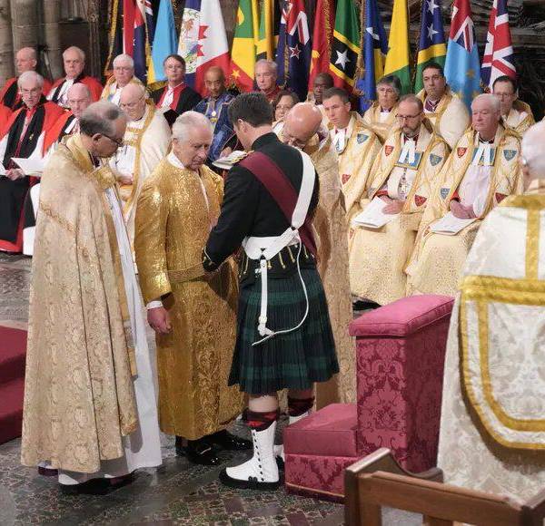 Con la mano sobre la Biblia, el rey prestó juramento. Después, en la parte considerada más sagrada de la ceremonia, el arzobispo Welby ungió las manos, el pecho y la cabeza del monarca, oculto de la vista por una pantalla.