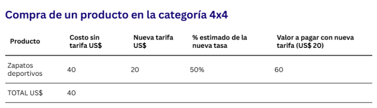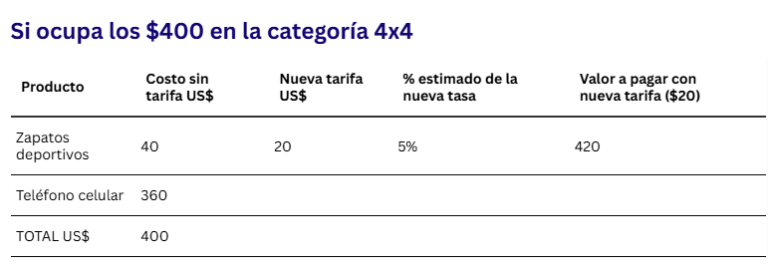 Esta tarifa se aplicará a los envíos clasificados bajo la Categoría B, conocida también como régimen 4x4, que permite importaciones personales de hasta 4 kilogramos con un valor FOB máximo de USD 400.